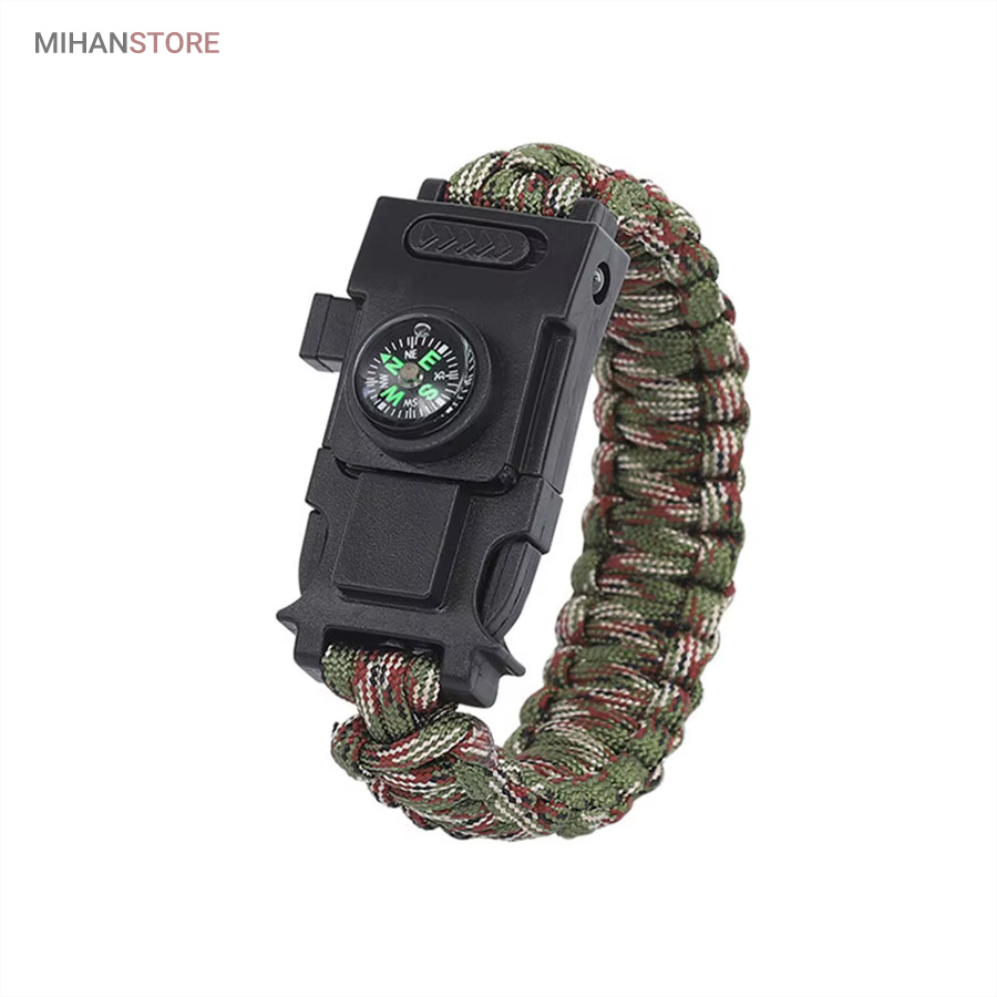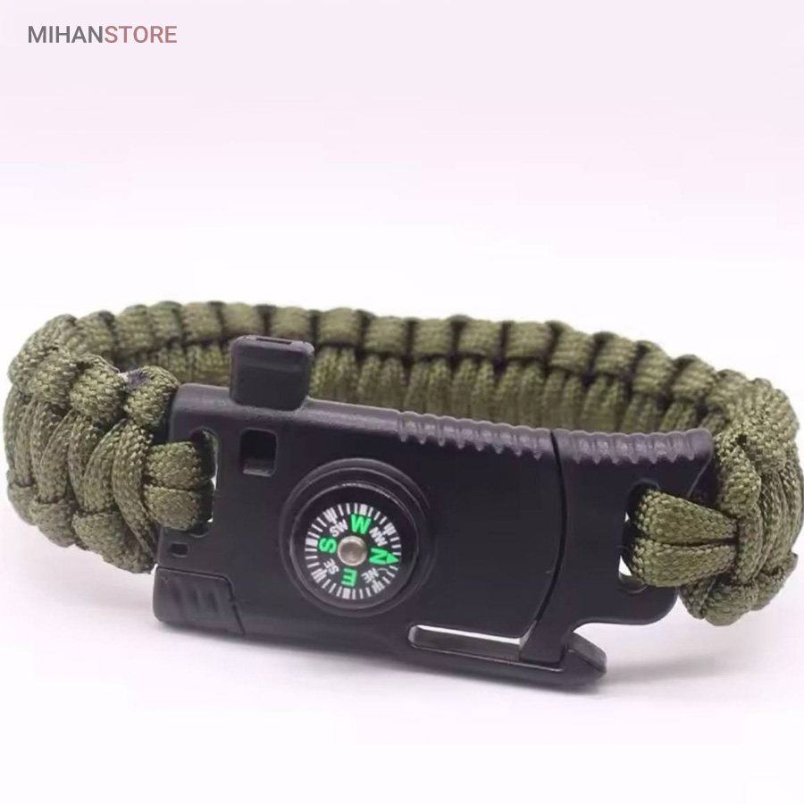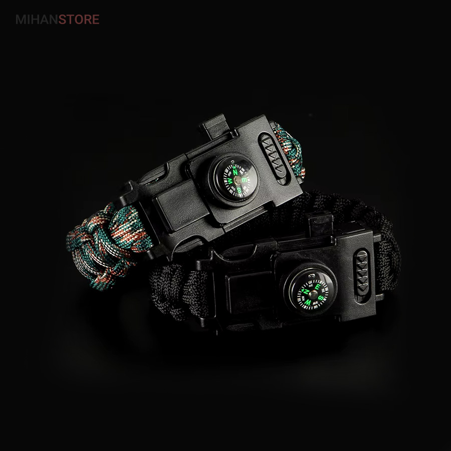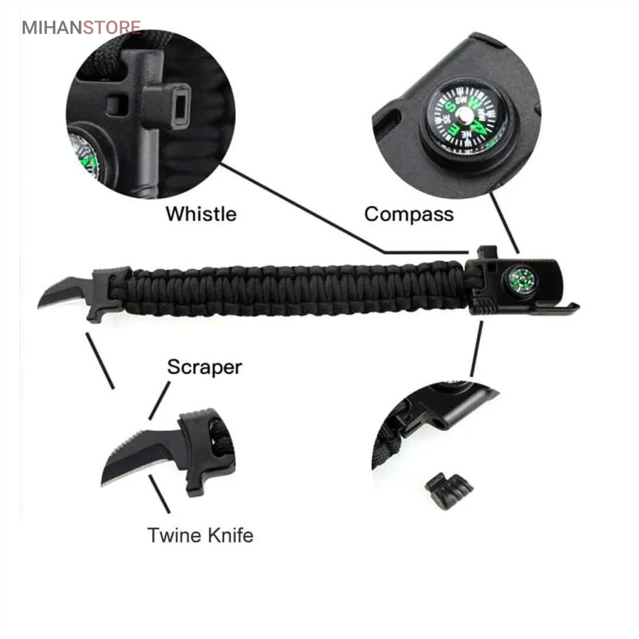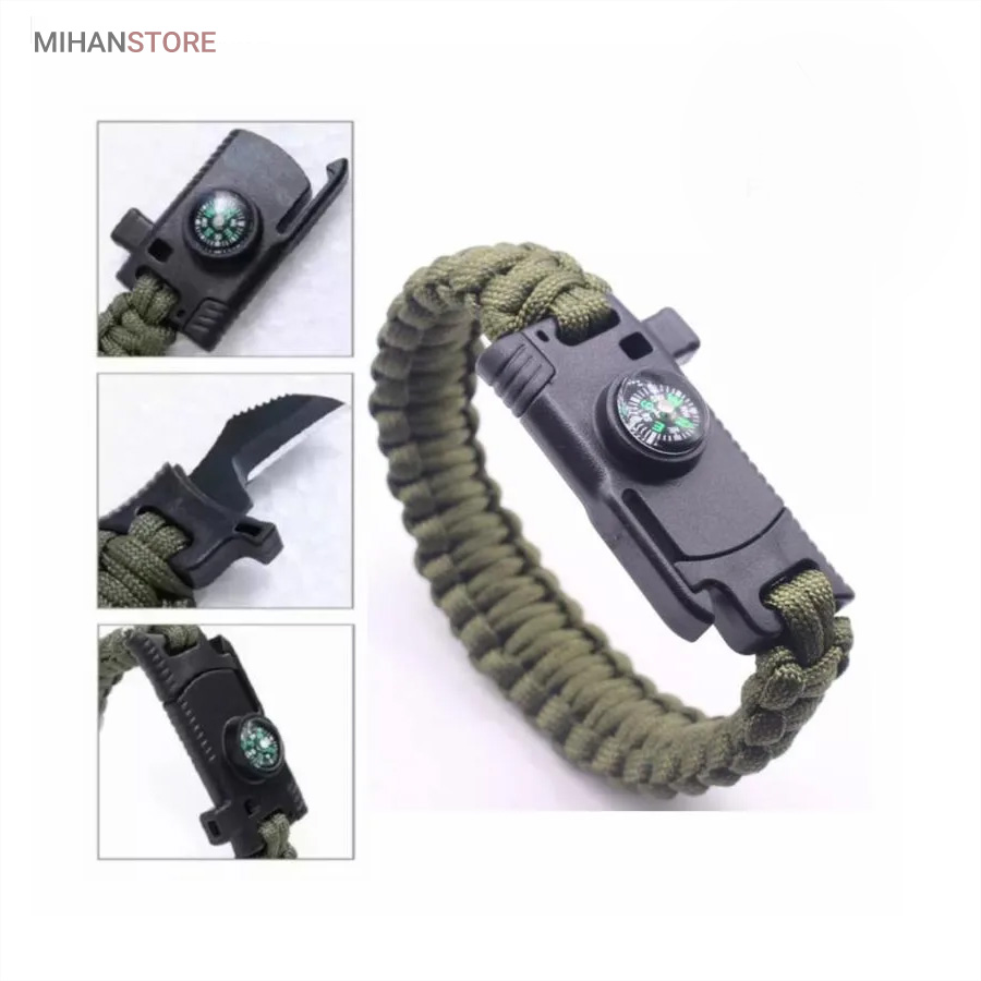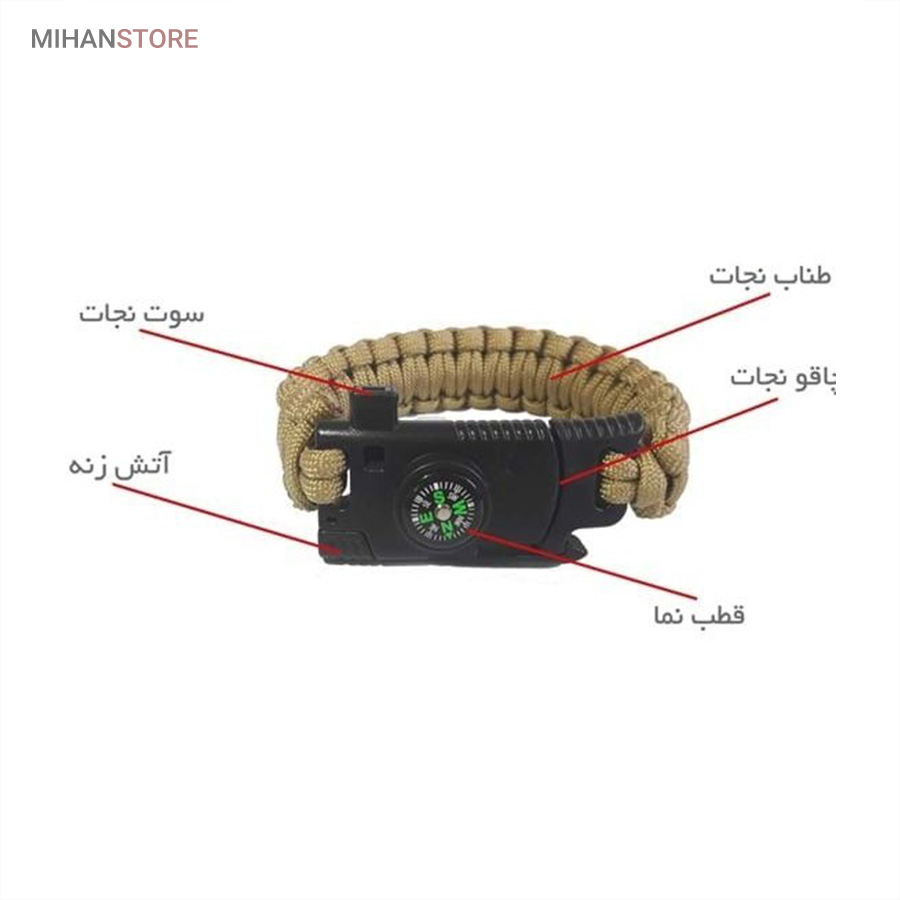 دستبند نجات، دستبند پاراکورد، ابزار نجات، وسایل کمپینگ، ابزار بقا، چاقو اضطراری، طناب نجات، سوت اضطراری، چخماق، دستبند چندکاره