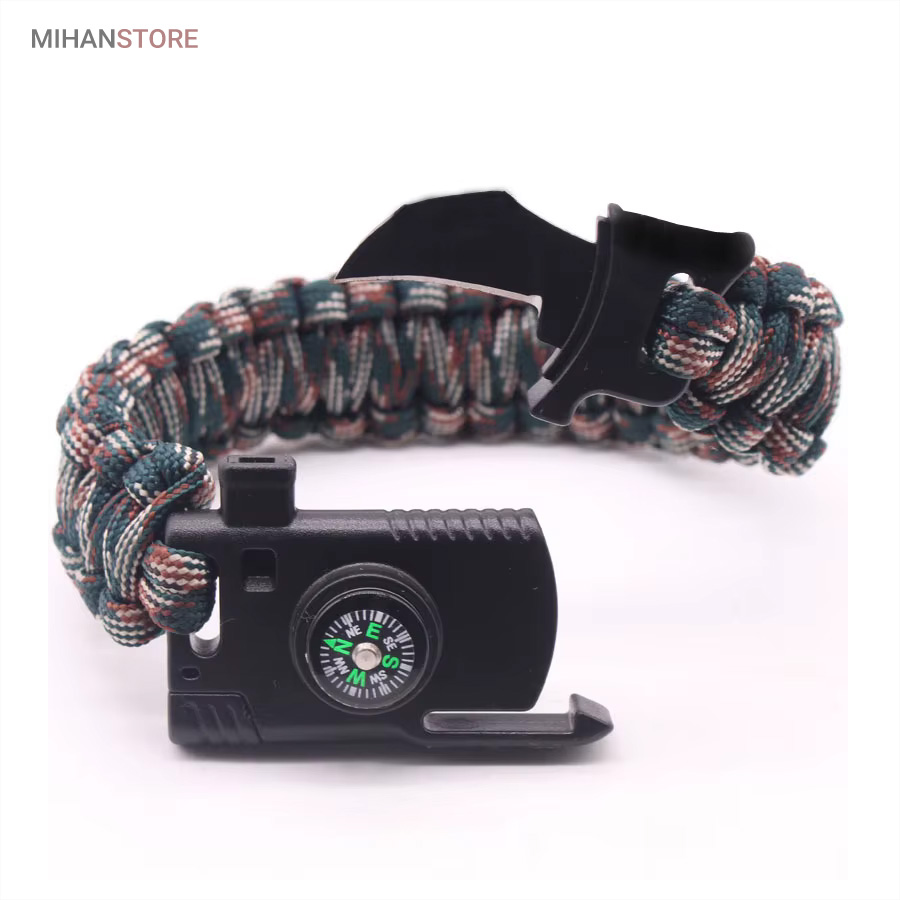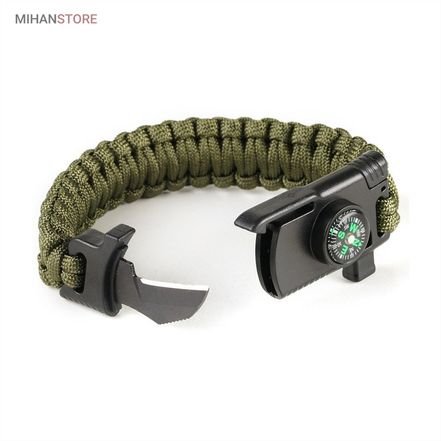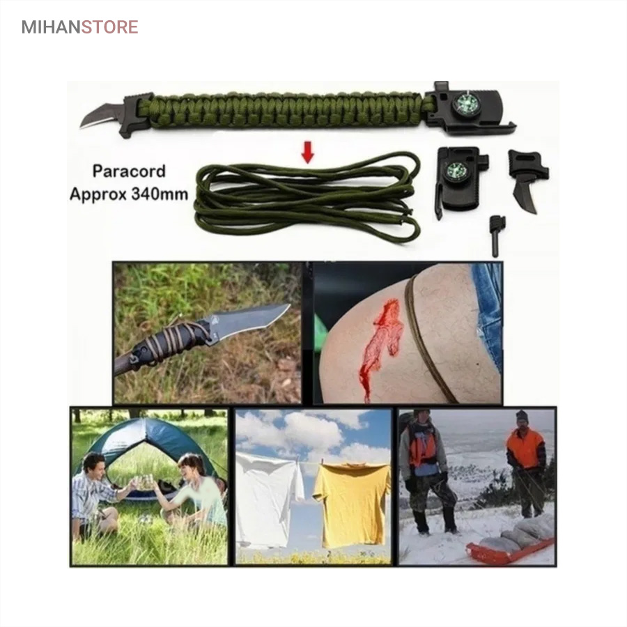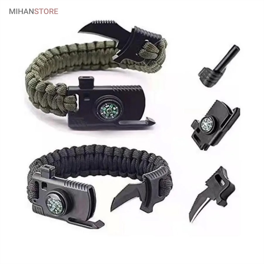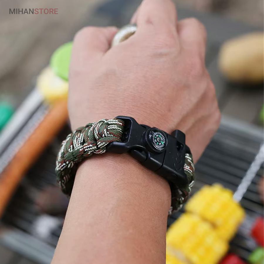 دستبند نجات، دستبند پاراکورد، ابزار نجات، وسایل کمپینگ، ابزار بقا، چاقو اضطراری، طناب نجات، سوت اضطراری، چخماق، دستبند چندکاره