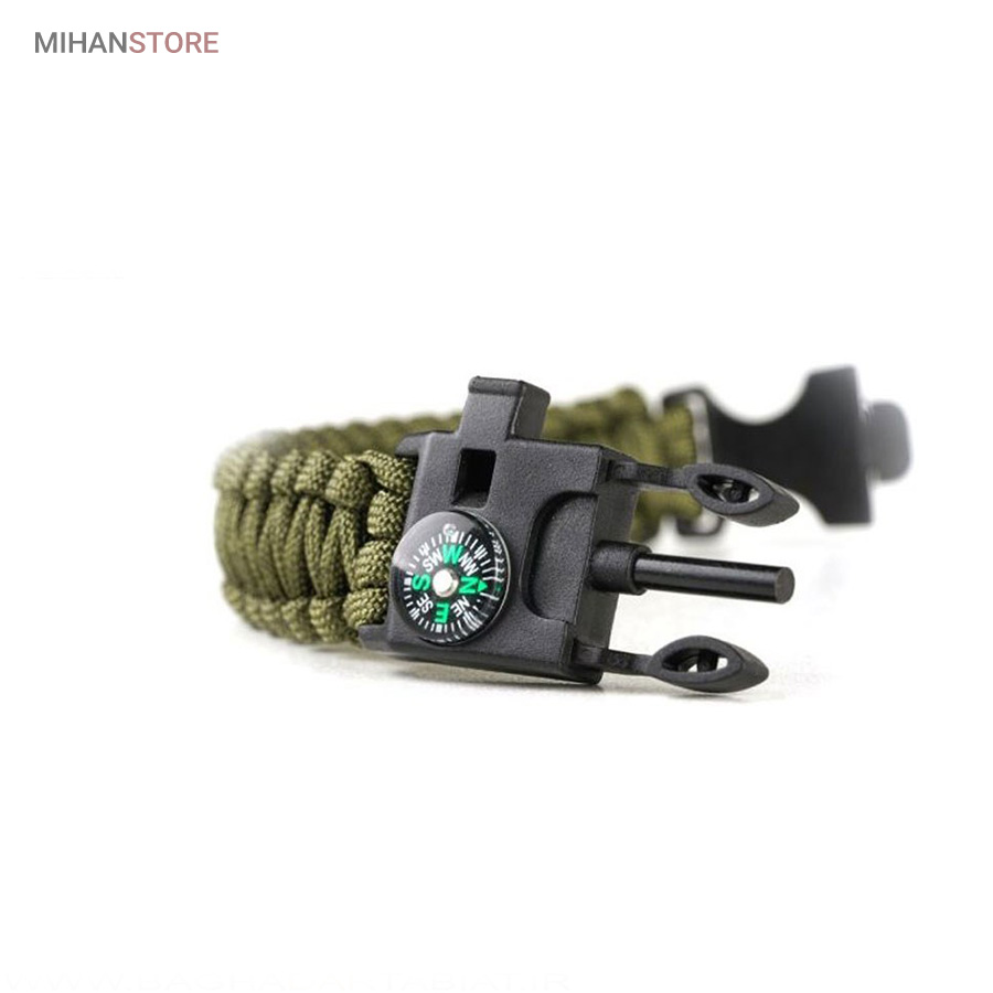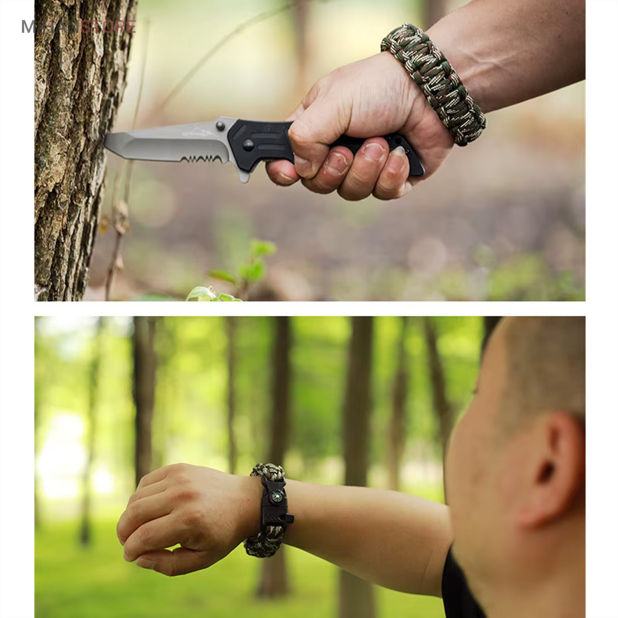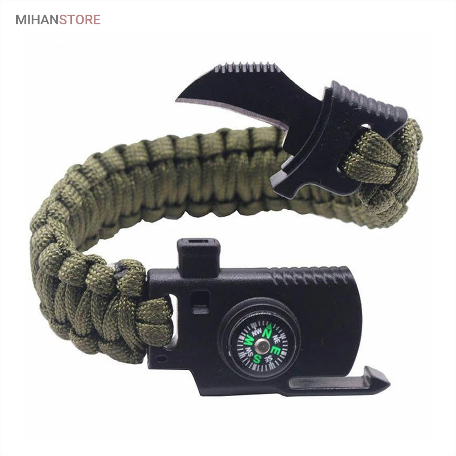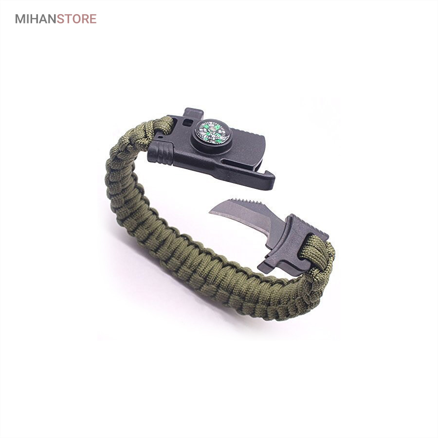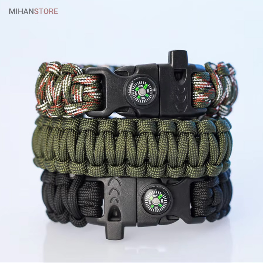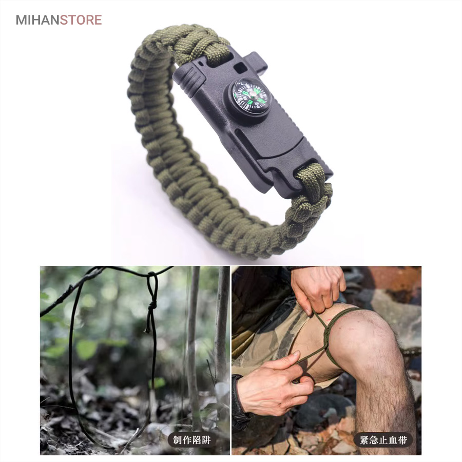 دستبند نجات، دستبند پاراکورد، ابزار نجات، وسایل کمپینگ، ابزار بقا، چاقو اضطراری، طناب نجات، سوت اضطراری، چخماق، دستبند چندکاره